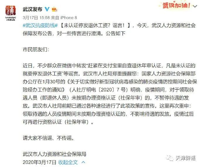 据@武汉发布 消息,武汉市人社局表示,根据人社部相关规定,疫情期间,对于领取待遇人员(即退休人员)未按期办理资格认证(社保年审)的,不暂停退休工资的发放。疫情过后可再进行资格认证(社保年审)。