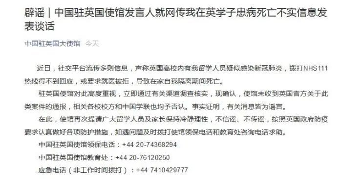 中国驻英国大使馆再次提请广大留学人员及家长保持冷静理性,不信谣、不传谣,按照英国政府防疫要求认真做好各项防护措施,如遇问题及时拨打使馆领保电话和教育处咨询电话求助。